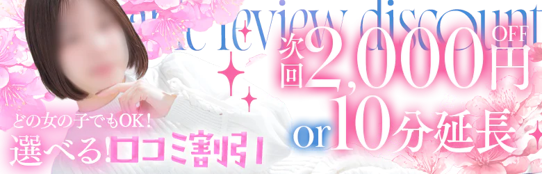 | 口コミ投稿するとどの女の子にも適用できる【2000円割引】or【10分延長】をプレゼント♪ | |