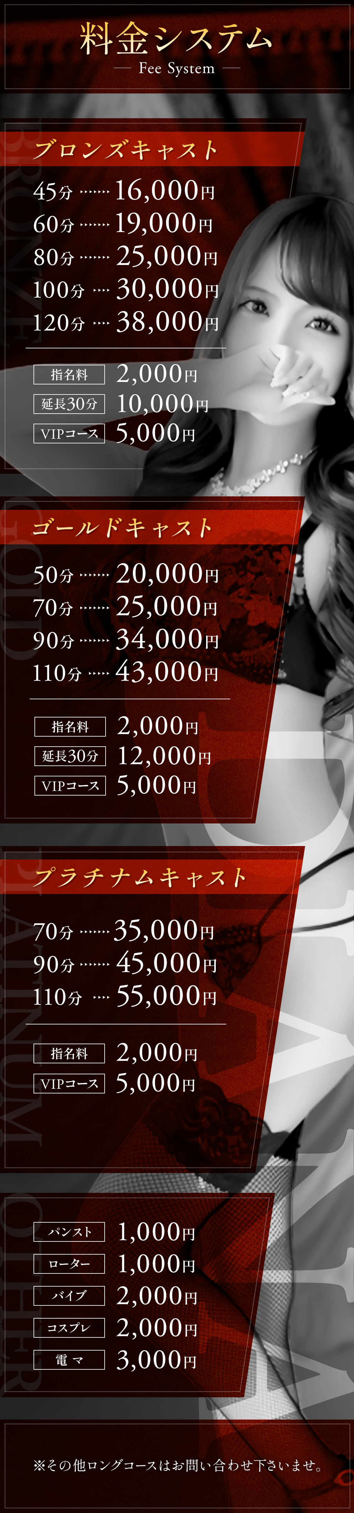 | BRONZE CAST 延長料金 30分 | 10,000円 | GOLD CAST 延長料金 30分 | 12,000円 |