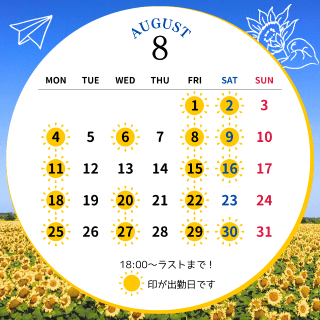 次回出勤は8/27(水)18:00〜!