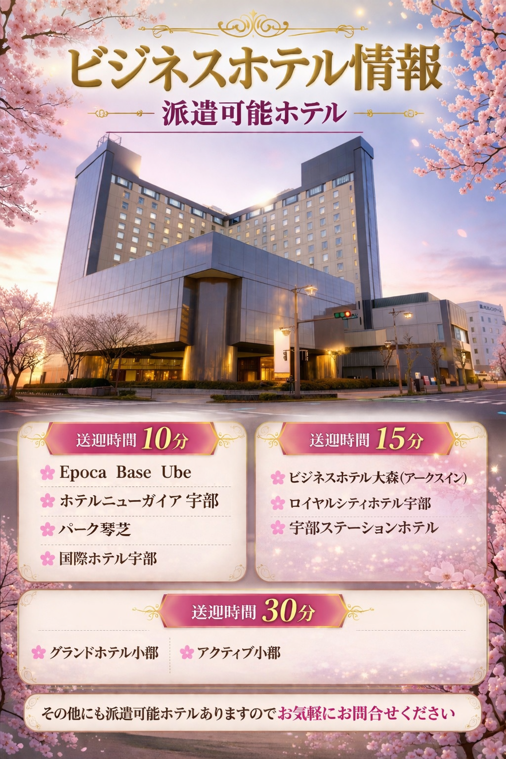 宇部市(ヨーロッパ近く)・小郡(USA近く)・湯田温泉に待機場所を設けております。
