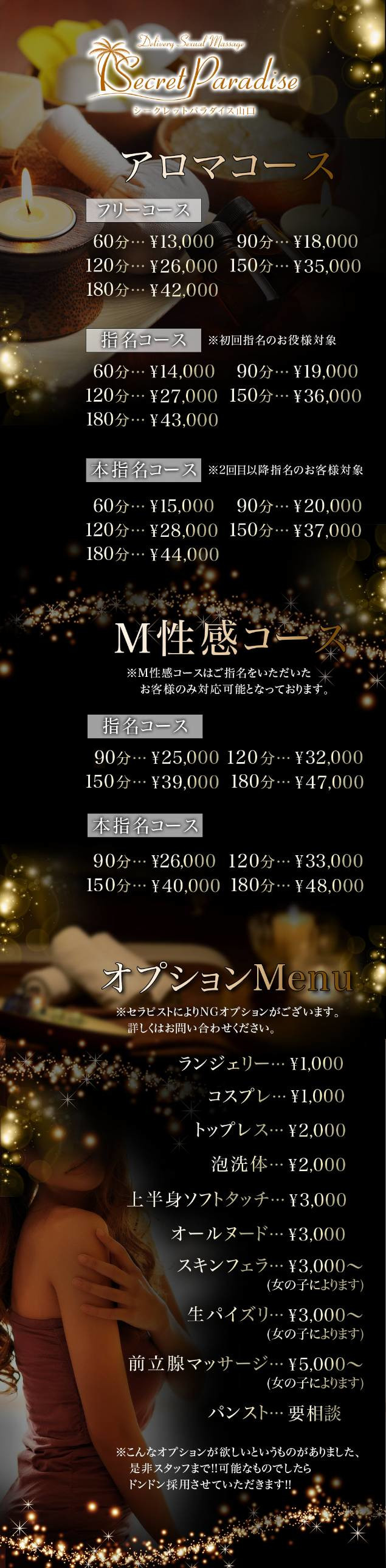 | ※M性感コースはご指名を頂いたお客様のみ対応可能となっております。 | |